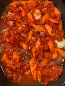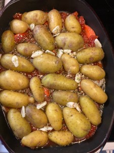 Paista kannellisessa vuoassa (tai peitä foliolla) uunissa 170c 1h ja poista kansi. Paista vielä 20-30min.