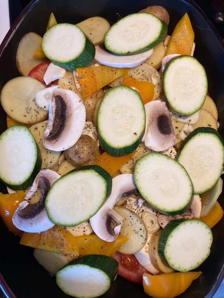 Pese perunat. Kuori halutessasi, itse käytän ne kuorineen. Viipaloi perunat mahdollisimman ohueksi. Munakoiso ja kesäkurpitsa leikataan paksummaksi viipaleeksi n. 1-2cm. Viipaloi herkkusienet ja leikkaa paprika jättäen sekin isohkoon kokoon. Tomaateista kanta pois ja n. Neljään osaan paksuiksi viipaleiksi. Kuori ja viipaloi valkosipulit. Valuta ja viipaloi mozzarella.
